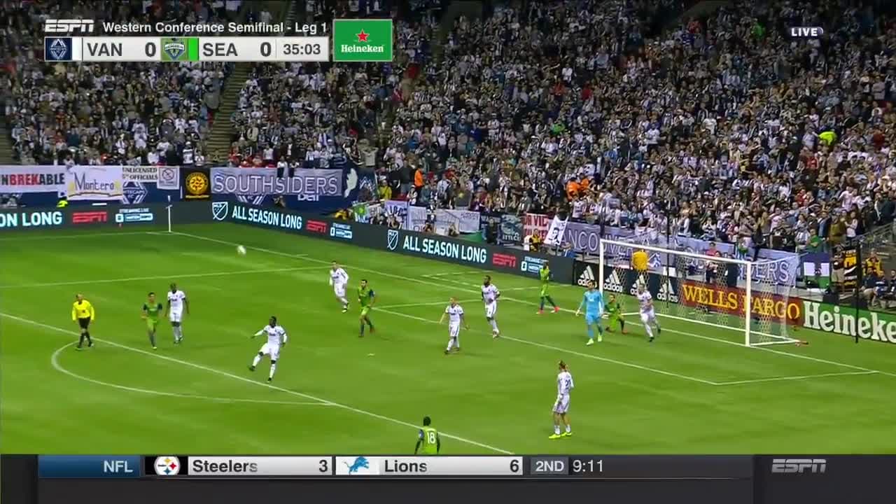 En el minuto 35 del primer tiempo el defensa de los Whitecaps, intentó despejar un centro y por poco hunde la pelota en su propia red.