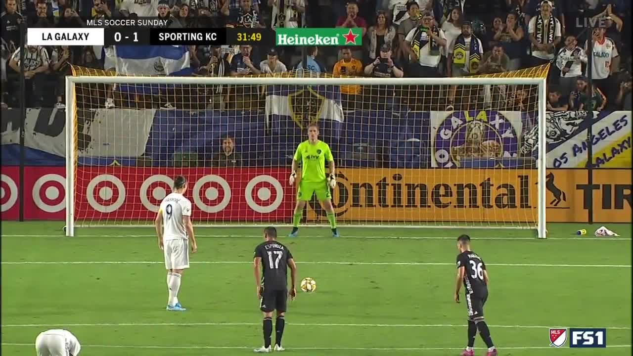 El portero de Sporting KC, Tim Melia, logra detener el tiro penal pero, el delantero sueco aprovecha el rebote e iguala el marcador 1-1