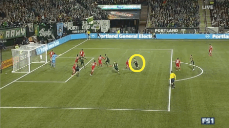 De nuevo hay marca hombre por hombre, pero en vez de enviar un centro al segundo palo, como lo hizo Seattle, Portland manda la pelota al primero, y González -quien ya aprendió de su error una semana antes- se queda en su arco. Al comienzo observamos en el círculo amarillo a Liam Ridgewell, quien anota el gol.
