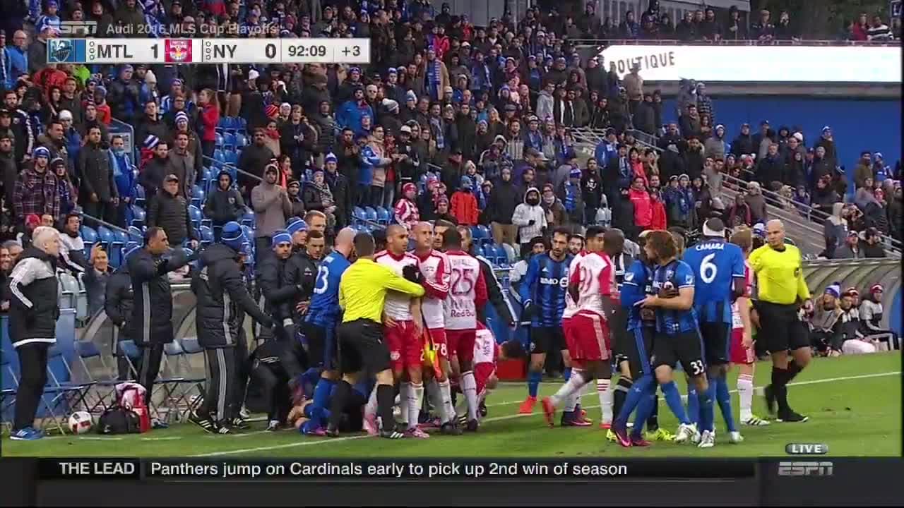 El jugador de los Red Bulls derriba a Callum Mallace enfrente del banquillo de Montreal y se encienden los equipos.