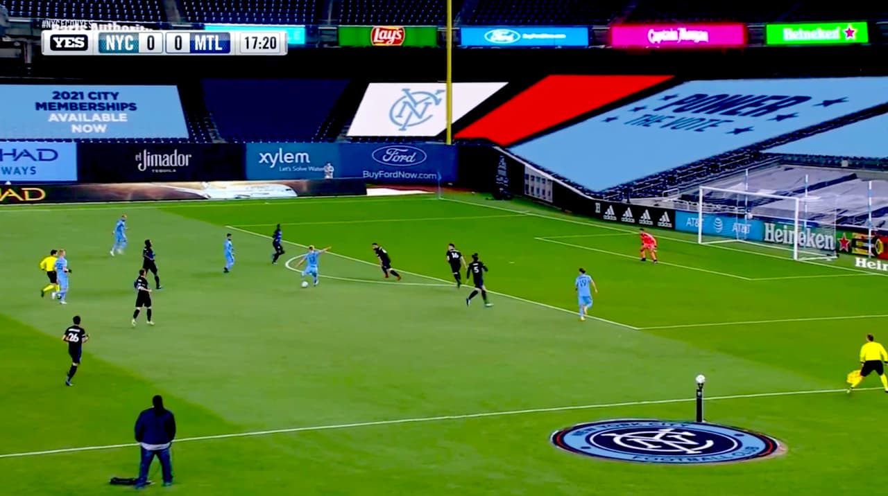 El portero de Montreal Impact, James Pantemis, le negó el gol a New York City FC al atajar un potente zurdazo de Gary MacKay-Steven.