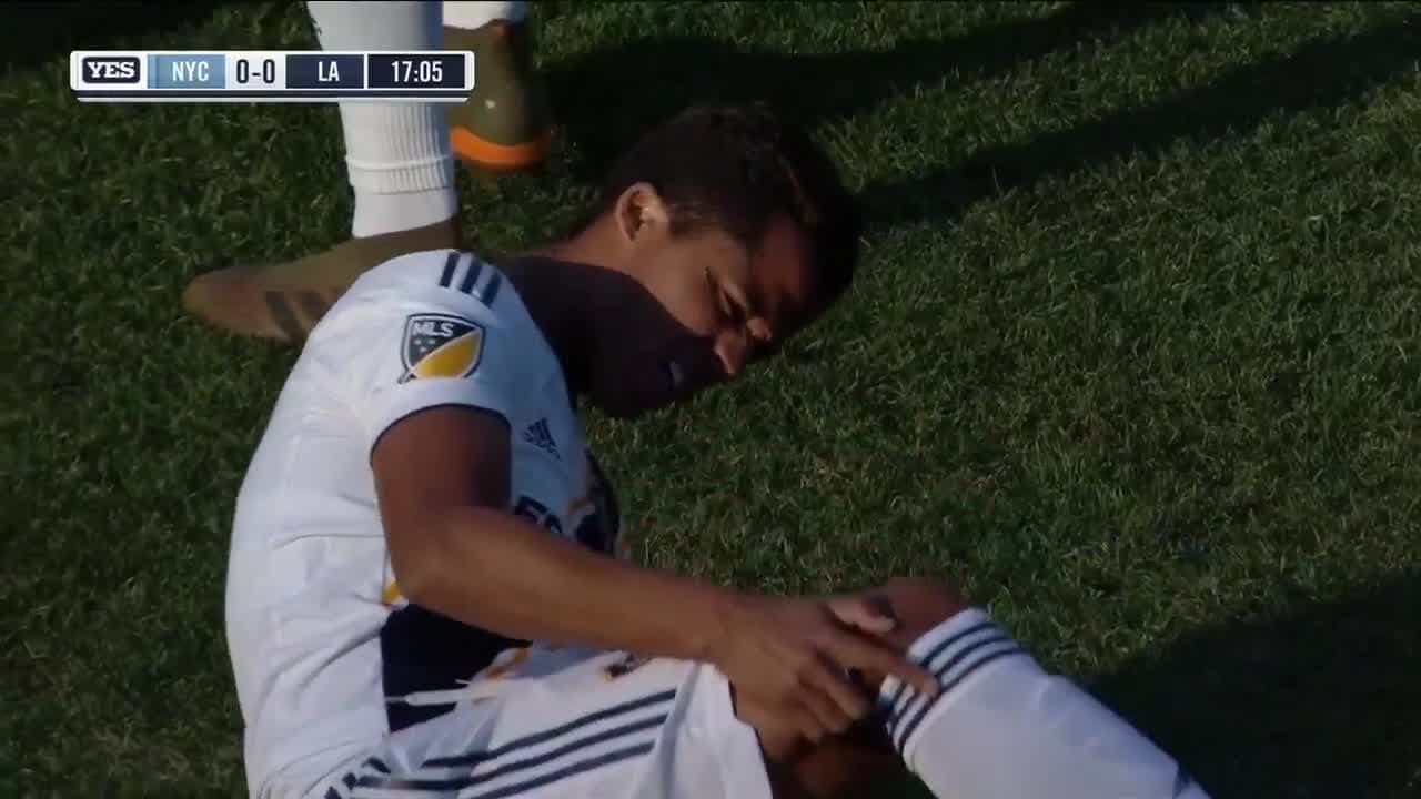 El mediocampista mexicano del L.A. Galaxy, recibe una fuerte agresión por parte del finlandés Alexander Ring del New York City FC.