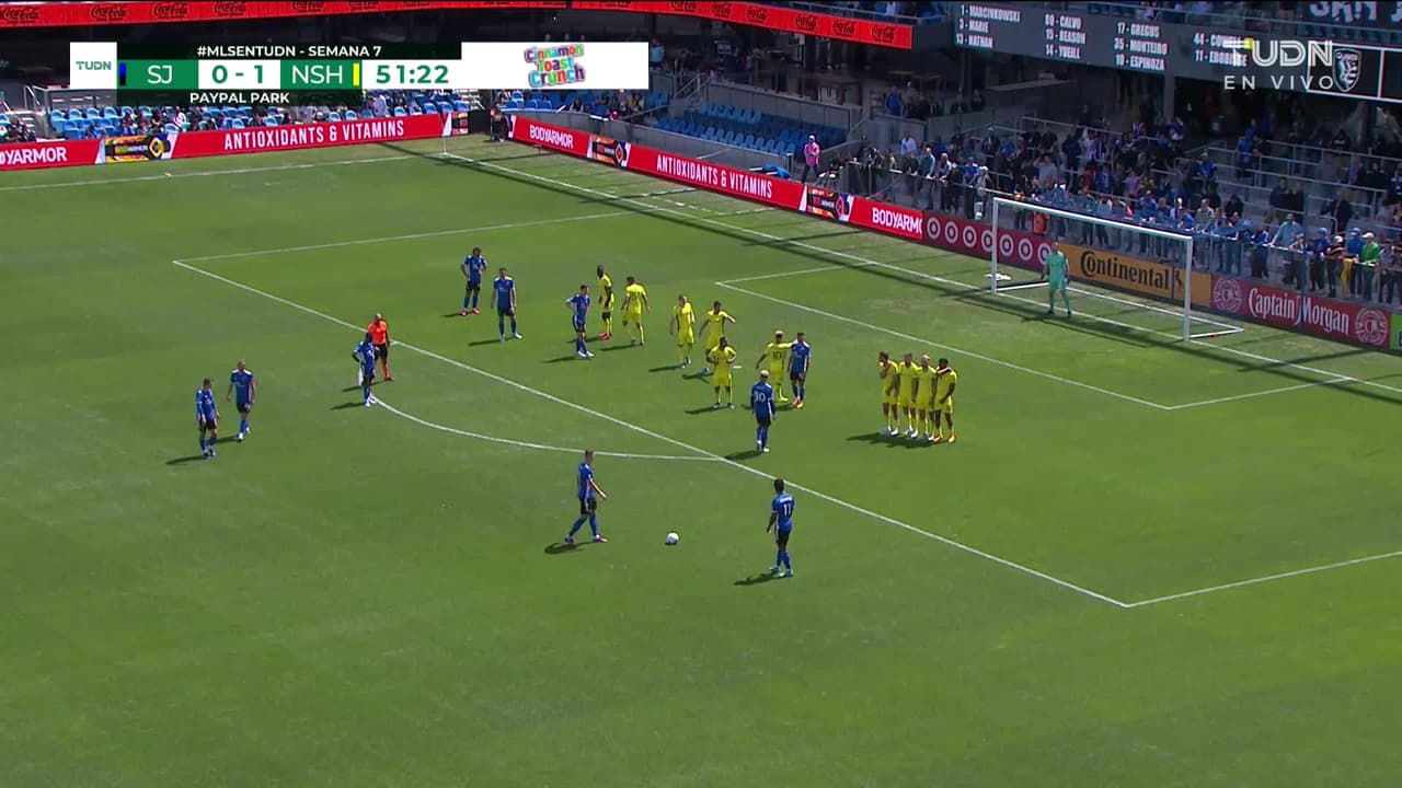 ¡Gol! SJ Earthquakes 1| Nashville MLS 1. Jeremy Ebobisse (SJ Earthquakes) marca de tiro libre directo| zurdazo al ángulo superior izquierdo.
