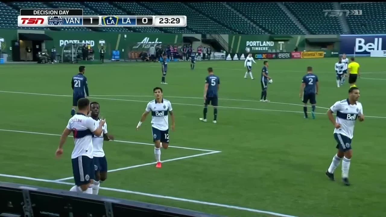 El delantero de los Whitecaps se eleva dentro del área y consigue el 1-0, llegando a seis goles en la temporada regular