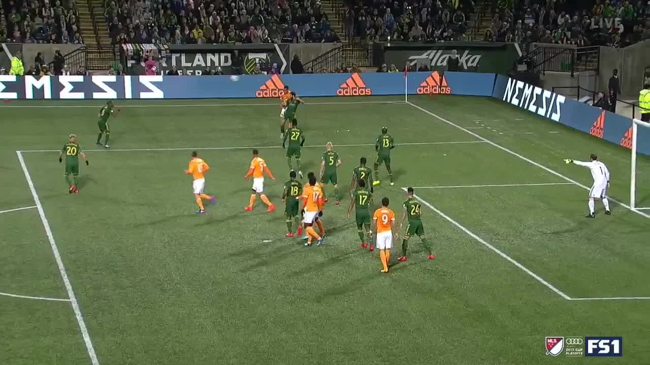 En una jugada de pelota detenida, el delantero catracho se cola en el área rival y saca un remate de cabeza que por poco se convierte en el 1-0 frente a los Portland Timbers.