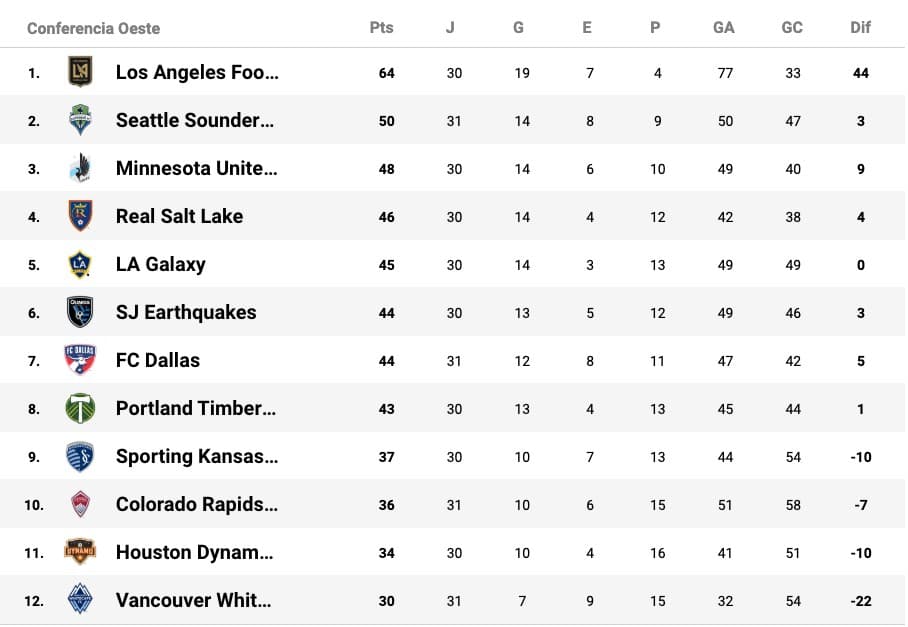 ¿Qué equipos serán locales en la primera ronda de los Playoffs? (Posiciones 2 a 4): en este momento la lucha por la segunda, tercera y cuarta posición es bastante impredecible he jockeying for the No. 2, No. 3 and No. 4 seeds, which bring with them a Round 1 home playoff match, will be fierce and unpredictable after the Seattle Sounders were held at home by FC Dallas on Wednesday. Next, the Sounders (No. 2), Minnesota United (No. 3) and Real Salt Lake (No. 4) all face tricky away matches on the weekend with the group of teams immediately behind them eager to take advantage of any opportunity to catch or even overtake them.