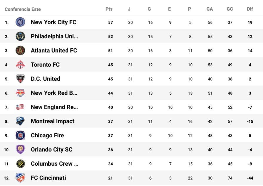 Posición número uno: New York City FC viajará a Texas para enfrentar a FC Dallas, con la ventaja de contar con un colchón de cinco puntos de ventaja como líder de la Conferencia Este. Philadelphia Union (que este fin de semana visitará a New York Red Bulls) y Atlanta United (que, tras vencer el miércoles por 2-0 a FC Cincinnati será local contra San Jose Earthquakes) estarán atentos para poder aprovechar cualquier desliz de NYCFC. La primera posición en ambas Conferencias otorga la ventaja de no tener que jugar la primera ronda de los Playoffs, además de mantener la condición de local a lo largo de la postemporada. Todas las instancias de los Playoffs se resuelven a partido único, sin posibilidad de revancha.