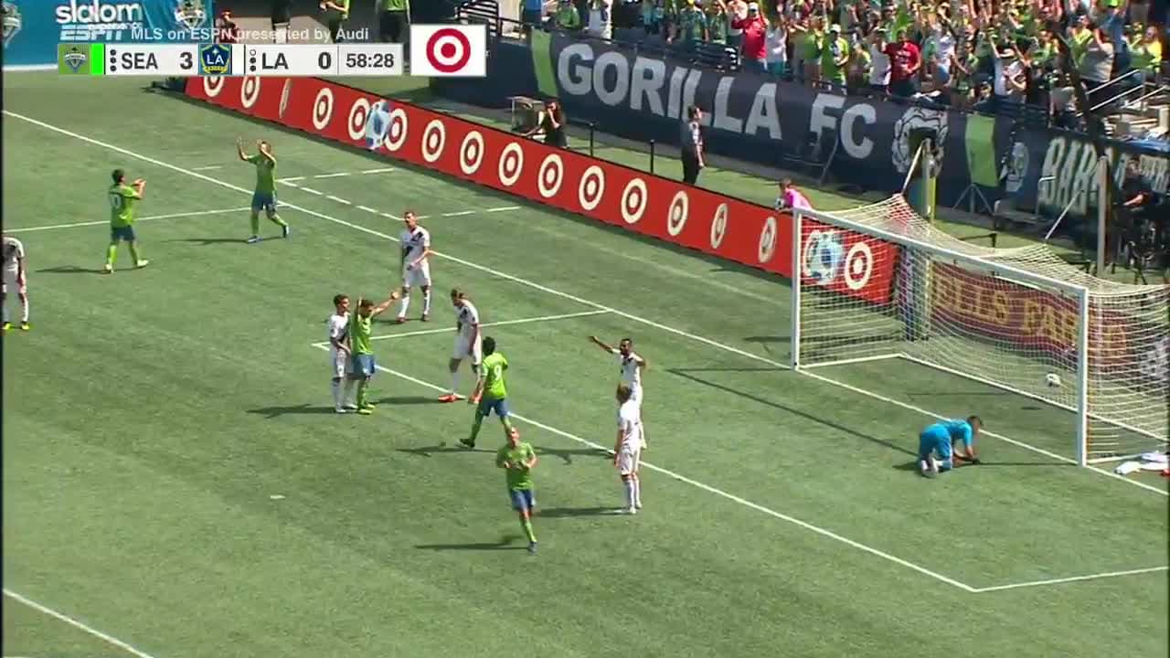 Nicolas Lodeiro continúa su show individual y dentro del área 'galáctica', pasea la pelota hasta que Roldán la recibe y consigue el cuarto para los Sounders.