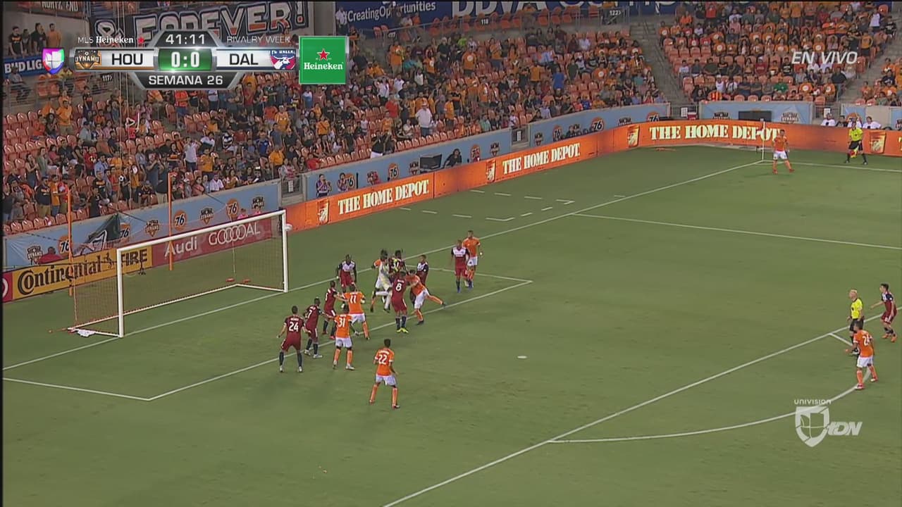 El atacante hondureño cabecea con facilidad en medio del área del club del norte de Texas.