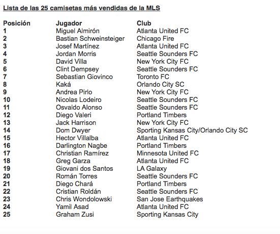 El ranking está basado en las ventas minoristas totales de camisetas adidas de la MLS a través de MLSstore.com, desde el principio de 2017 hasta el final de la temporada regular.