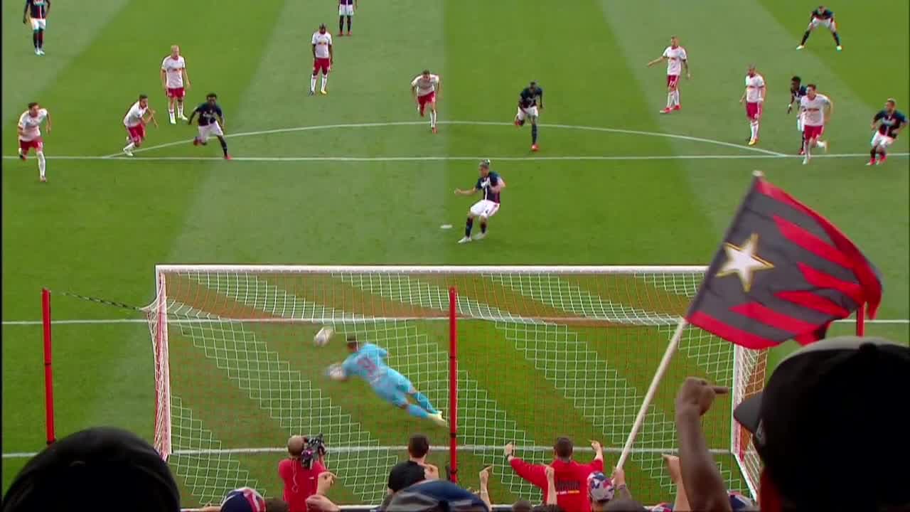 Desde los 12 pasos, el hombre gol de Nueva Inglaterra vence la estirada del meta de Red Bulls Luis Robles.