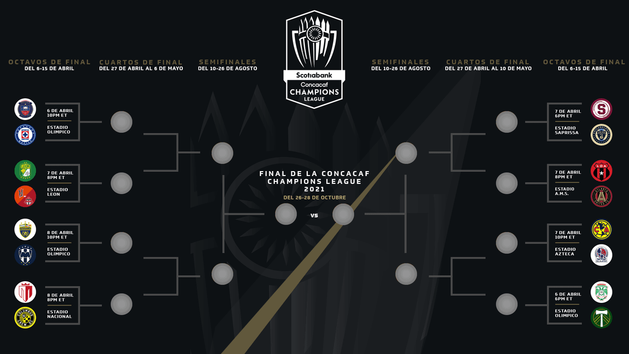 El calendario para los partidos de Octavos de final de la Concacaf Champions Leagiue está a continuación, con el club local listado primero y los horarios de inicio en hora del Este de los Estados Unidos:
