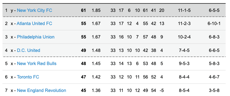 En tanto, la victoria de Columbus Crew 2-0 sobre Philadelphia Union confirmó a NYCFC como la primera siembra del Este y como el único equipo que descansará en la primera ronda de los playoffs.