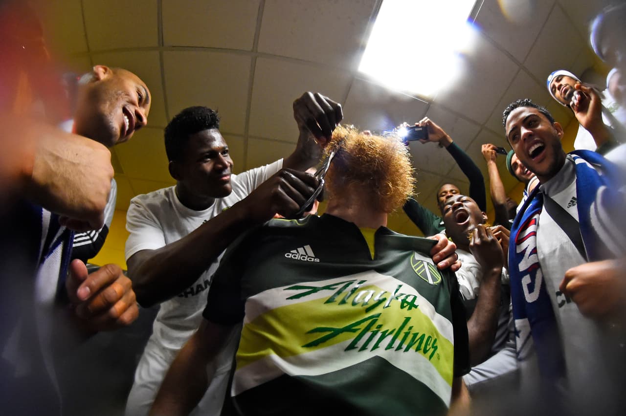 Al parecer la barba colorada de Borchers trae suerte. Darlington Nagbe hacer una bendición antes del ritual de las tijeras.