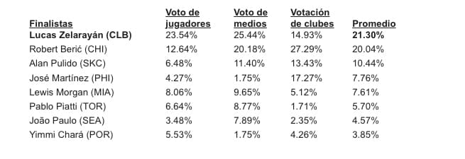 Zelarayán le ganó la contienda a otros jugadores destacados como Robert Berić de Chicago Fire FC y otras nuevas figuras que fueron clave en la clasificación de sus respetivos clubes a los Audi 2020 MLS Cup Playoffs, incluyendo el mexicano, Alan Pulido ( Sporting Kansas City), el venezolano, José Martínez ( Philadelphia Union), Lewis Morgan ( Inter Miami CF) y su compatriota Pablo Piatti (Toronto FC), entre otros destacados fichajes.