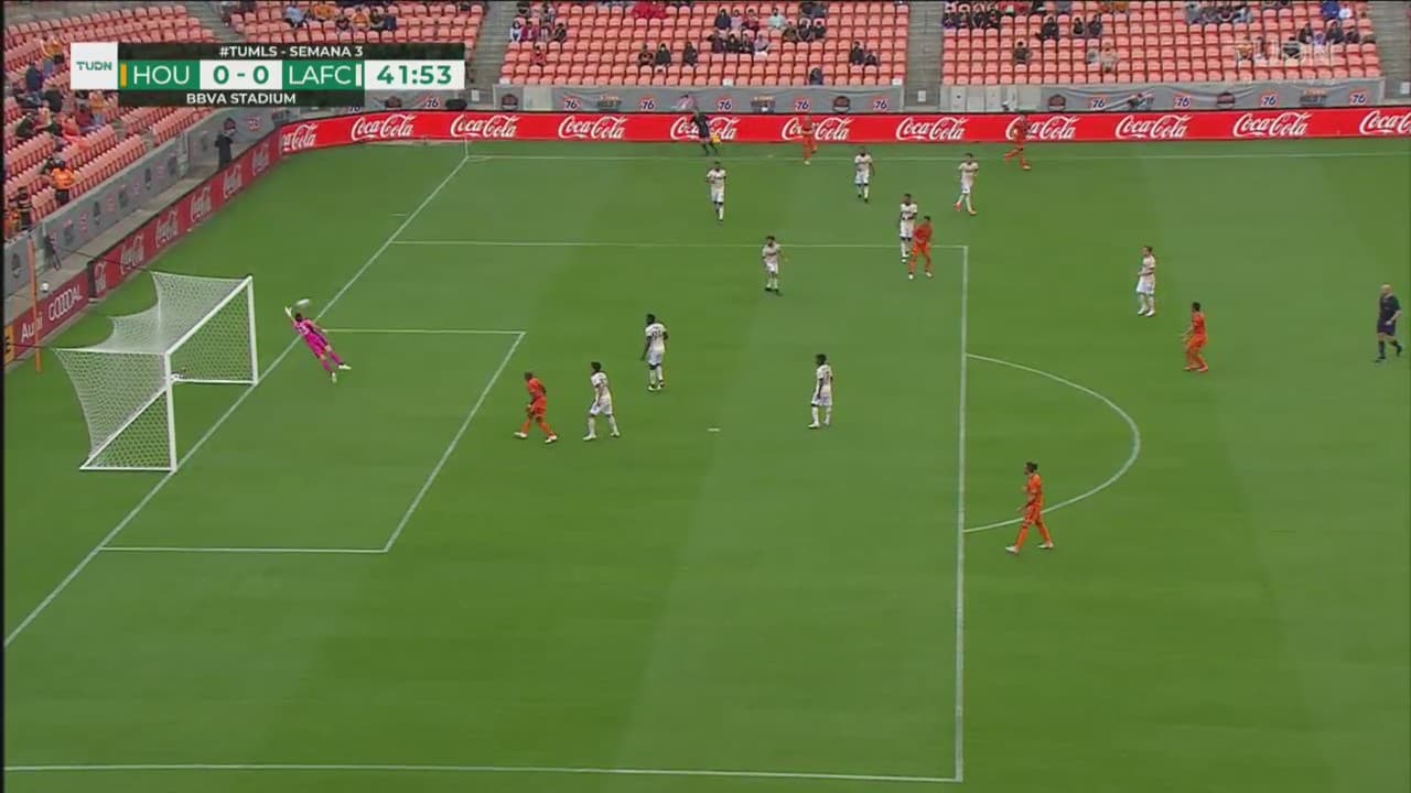 El mediocampista de Houston mete un bombazo buscando el poste y el mexicano le niega el tanto, al 42'.