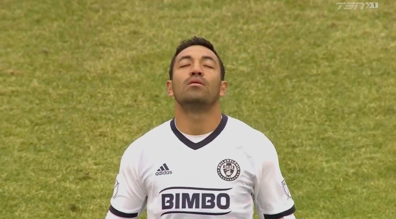 El jugador tapatío, Marco Fabián, hizo su tradicional rezo previo a su debut en la MLS vistiendo la playera de Philadelphia Union.