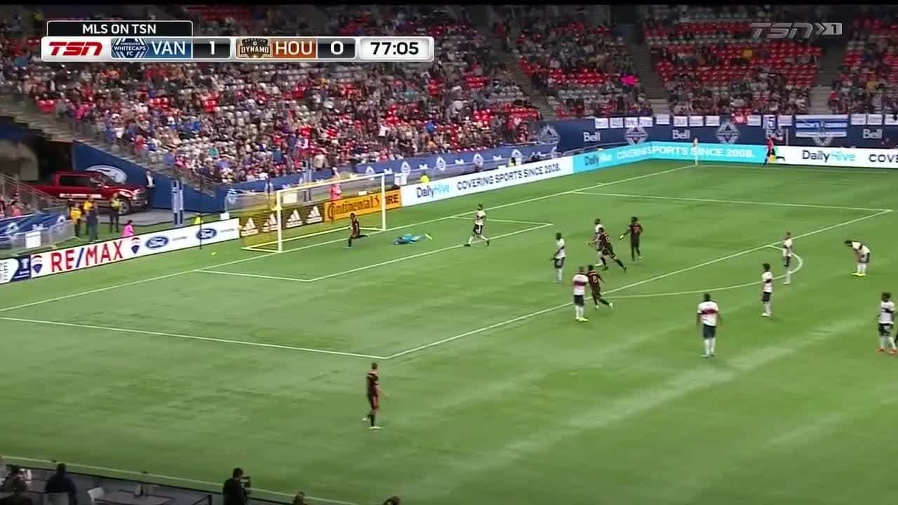 El defensor hondureño le pega fuerte al balón y el guardameta de los Vancouver Whitecaps, cede el rebote que es aprovechado por el colombiano para el 1-1.