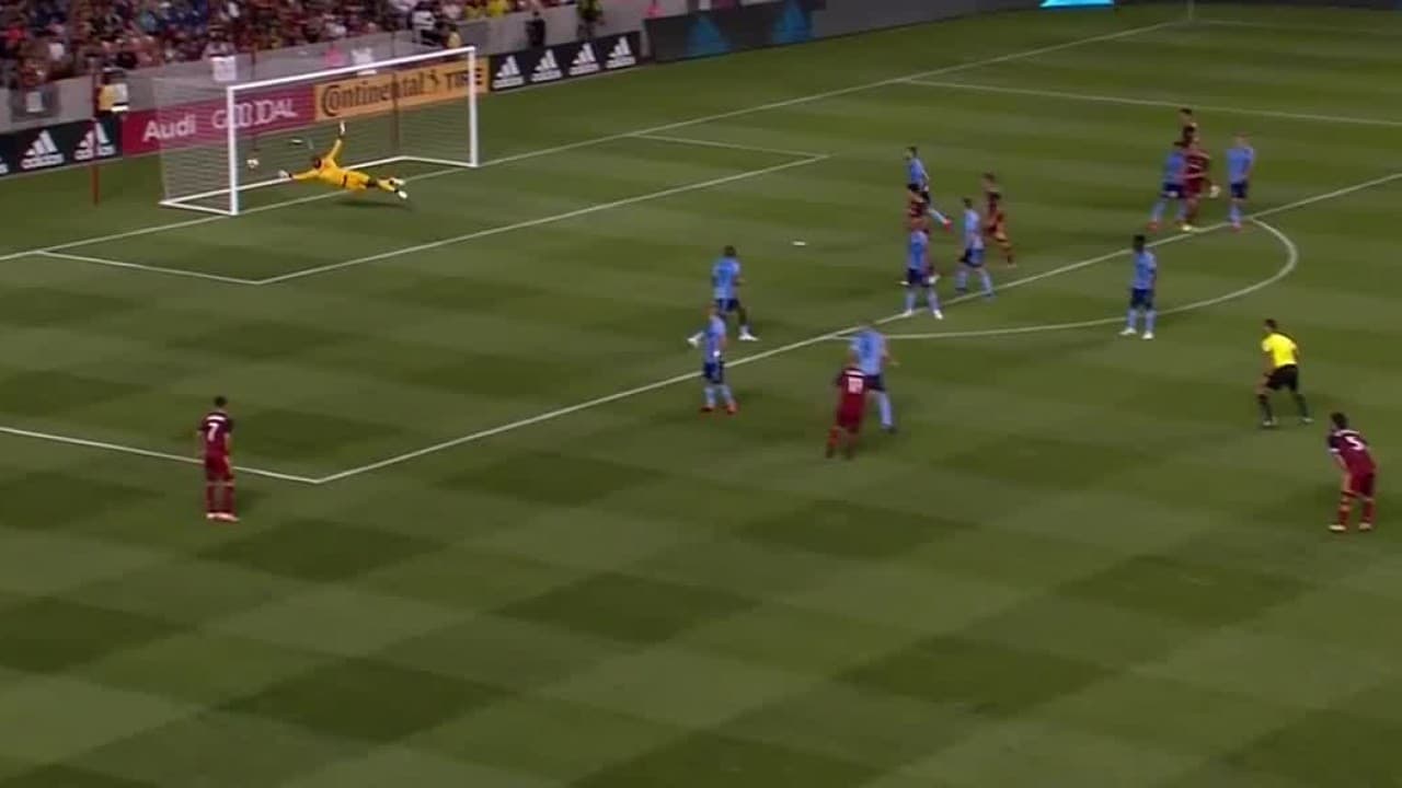 El mediocampista europe saca un potente remate de pierna derecha, imposible de detener por el portero de New York City FC, para el 2-1 de su equipo.