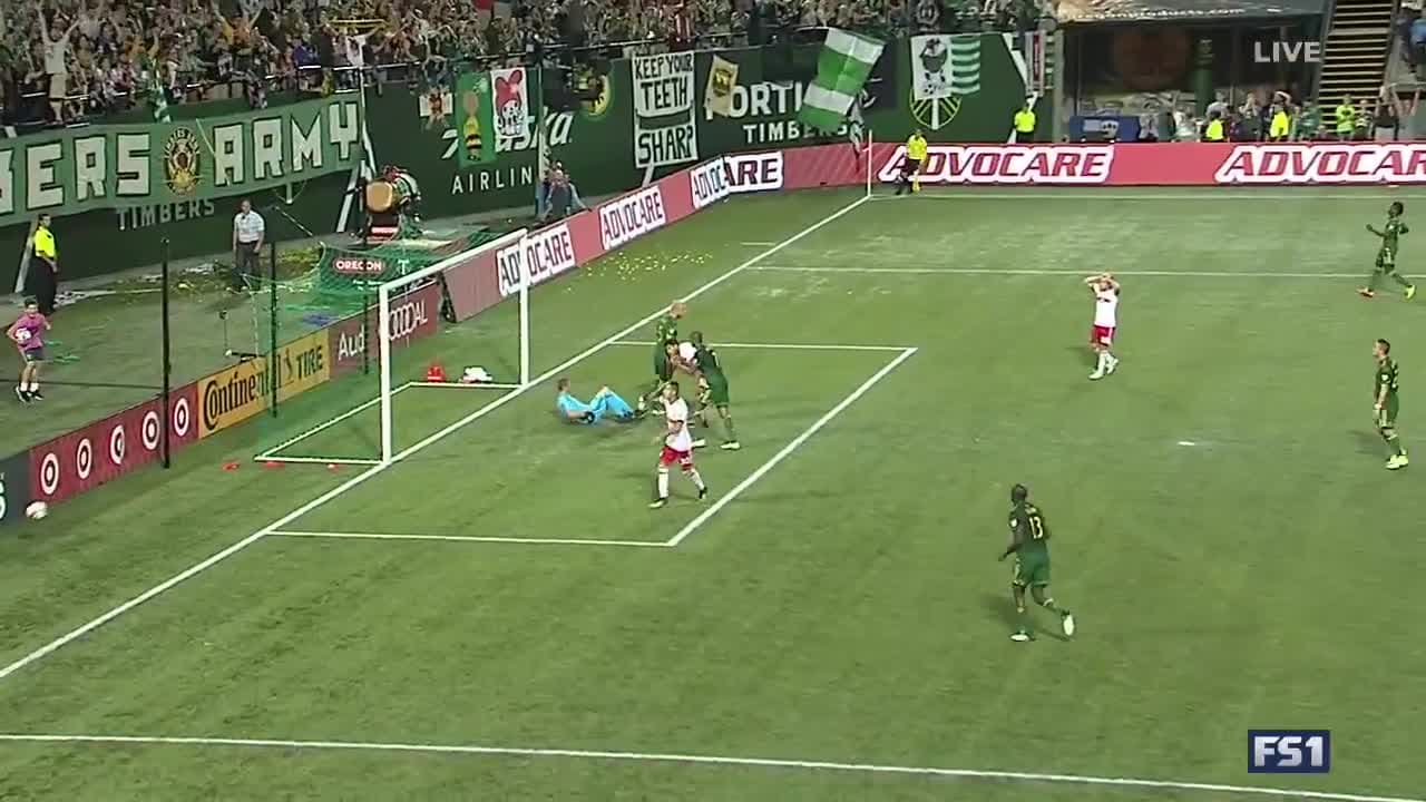 El guardameta estadounidense reacciona rápidamente para detener el cabezazo del atacante de los Red Bulls y mantener la ventaja de Portland.