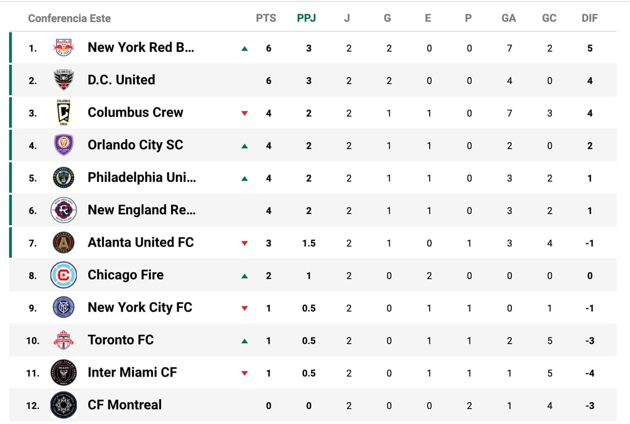 Chicago Fire suma dos puntos tras igualar en sus dos primeros compromisos, mientras que el vigente campeón - New York City FC- sorprende al apenas sumar un punto en dos encuentros, tras igualar sin goles el sábado frente a Vancouver Whitecaps FC. Lo acompañan Toronto FC e Inter Miami CF.