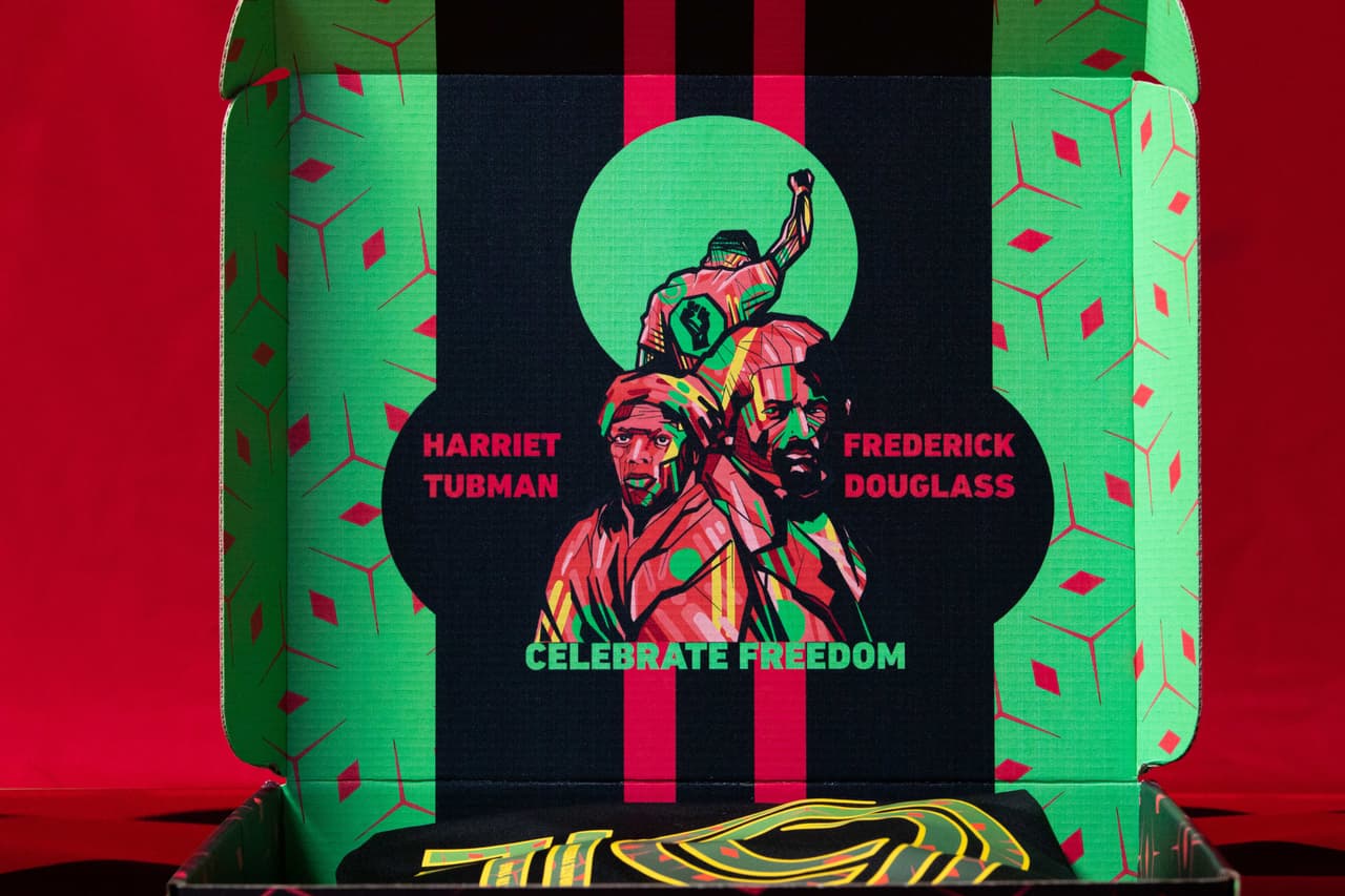 Los números de la camiseta y el empaque de la camiseta de edición limitada ilustran la historia y la importancia de Juneteenth, además de rendir homenaje a Harriet Tubman y Frederick Douglass. Las imágenes refuerzan el mensaje de que los jugadores afrodescendientes en la MLS se mantienen erguidos porque se paran sobre los hombros de los luchadores por la libertad que los precedieron.
