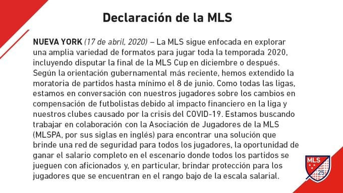 Major League Soccer ha extendido la moratoria de partidos al menos hasta el 8 de junio, señaló la liga a través de un comunicado publicado el viernes. El juego ha estado suspendido desde el 12 de marzo debido al impacto de la pandemia de COVID-19. Además, la liga comunicó que se encuentra en conversaciones con la Asociación de Jugadores de MLS con respecto a la compensación de futbolistas debido al impacto financiero que la pandemia de COVID-19 tiene sobre la liga y sus clubes.