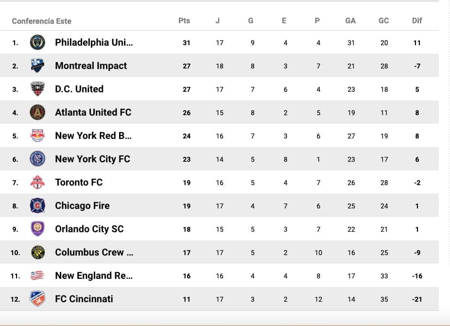 . Montréal Impact y D.C. United (ambos con 27 unidades), que se mantienen bastante firmes pese a diversos sobresaltos y contratiempos vividos por los dos planteles.