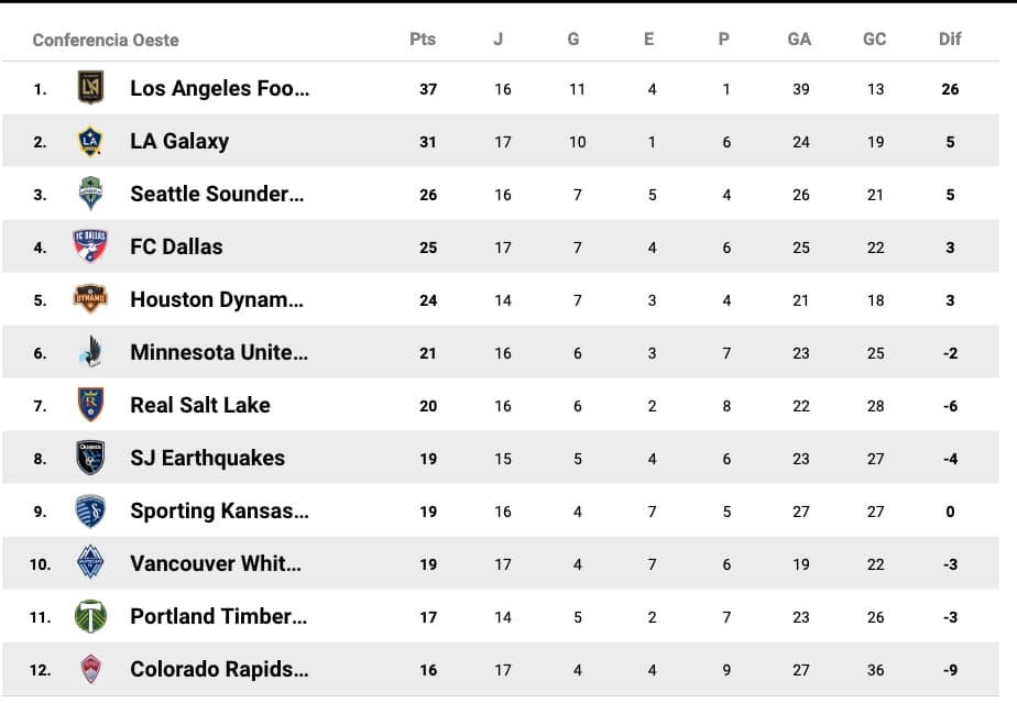 Un escalón por debajo -y con diferencias mínimas en su puntaje actual- encontramos a Seattle Sounders (26 puntos), FC Dallas (25) y Houston Dynamo (24).