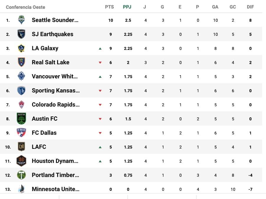Seattle Sounders se consolidó como líder del Oeste y de la tabla general al vencer 2-1 como visitante a P ortland Timbers. Con 9 unidades encontramos a San Jose Earthquakes y LA Galaxy, tras derrotar a Real Salt Lake y LAFC, respectivamente. Llama la atención las 5 unidades del equipo de Carlos Vela y el hecho de que Minnesota United todavía no haya cosechado puntos en 4 jornadas disputadas.