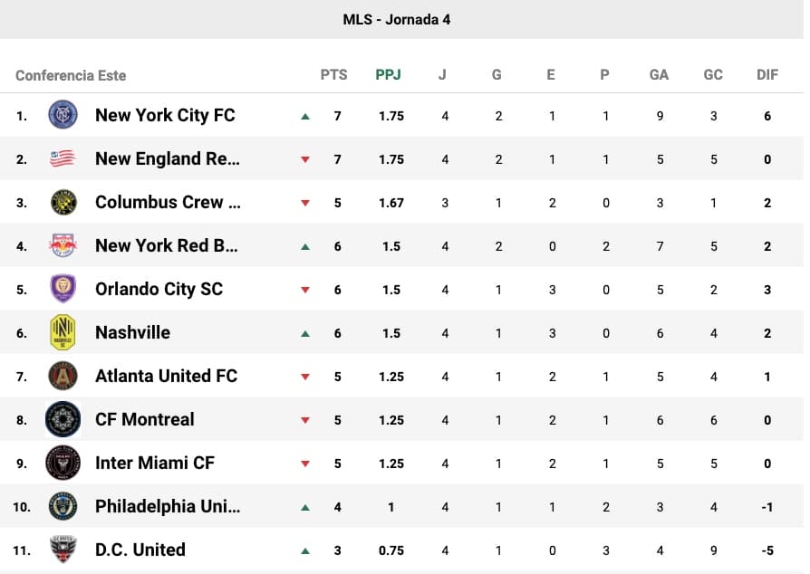 Tras la disputa de la cuarta jornada de la temporada regular de Major League Soccer, New York City FC dio caza a New England Revolution en la primera posición de la Conferencia Este, gracias a su empate a domicilio frente a Orlando City SC y a la derrota de 'los Revs' en su partido ante Nashville SC. Cerca están Red Bulls, 'los Leones' y Nashville, todos con 6 puntos, y un poco más abajo equipos como Atlanta United FC y Columbus, que muestran signos de recuperación. Toronto FC, FC Cincinnati y Chicago Fire están en el cierre de la tabla del Este, con apenas un punto.