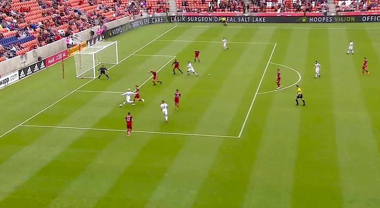 El español Alejandro Pozuelo escapó entre dos rivales y sacó un potente disparo de pierna izquierda, pero el veterano portero, Nick Rimando, evitó la anotación con una sublime estirada.