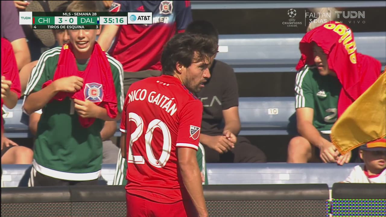 El jugador argentino cobra magistralmente un tiro de esquina pero el balón se estrella en el travesaño y evita el cuarto gol del Chicago Fire.
