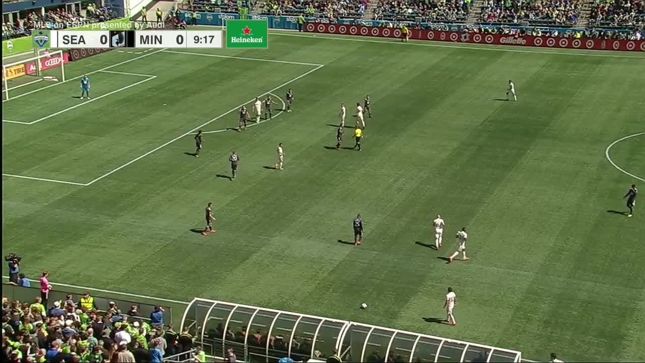 Poderoso zurdazo de Alexander Roldán que pasa cerca de la portería, Seattle cerca del gol