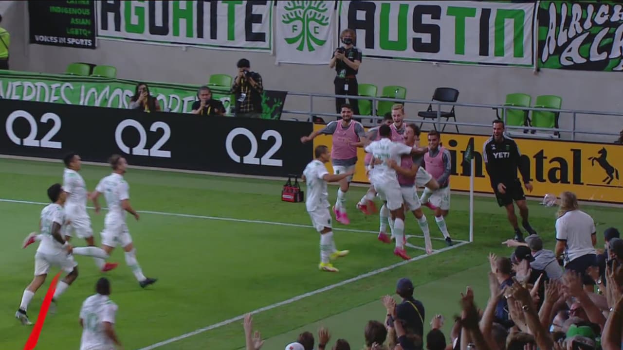 Orrin Gaines se lució con un remate en el área ante Los Angeles Galaxy en el Q2 Stadium.