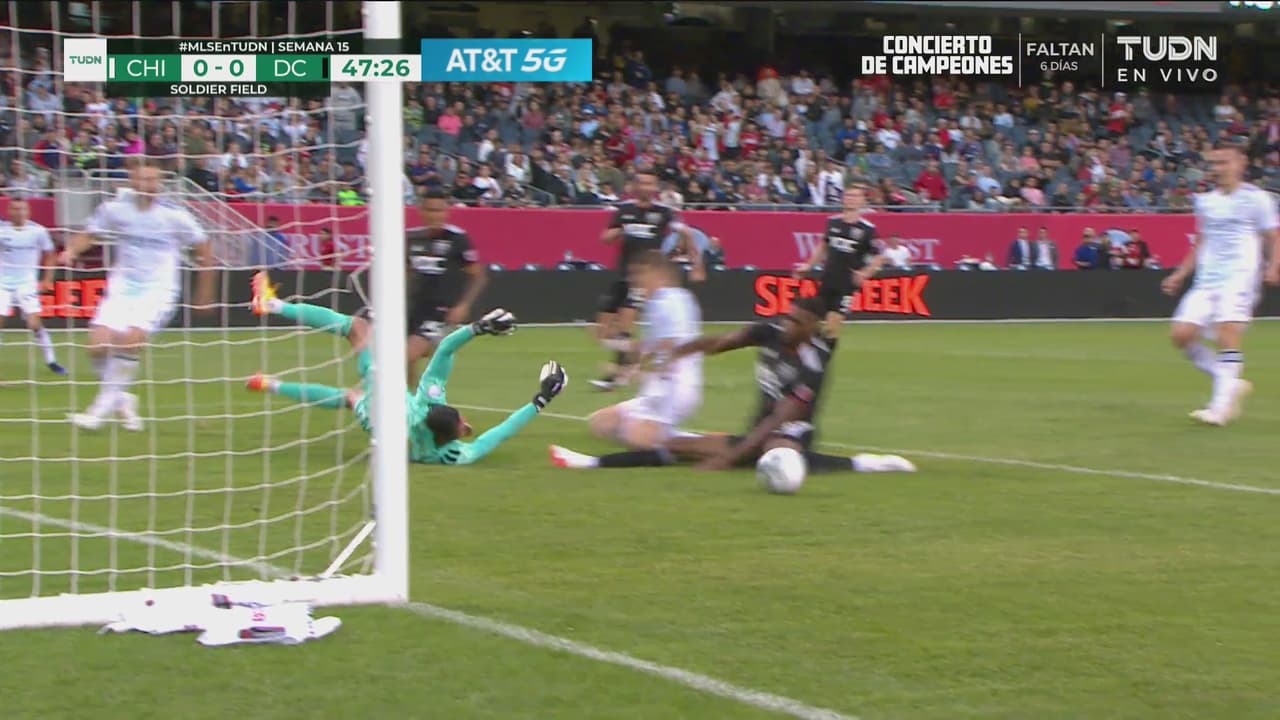 Centro por izquierda que no logran empujar Muller ni Przybylko y se escapa el gol a Chicago Fire al 48’.