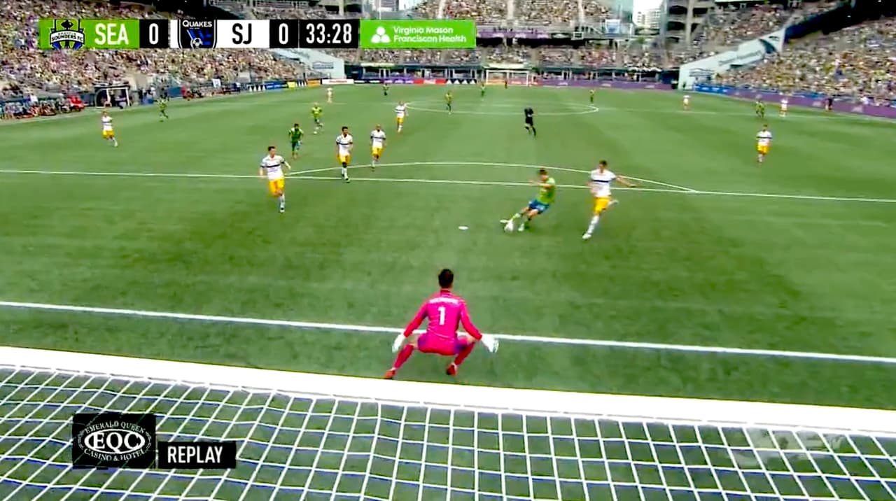 El cancerbero de San Jose Earthquakes, JT Marcinkowski, le negó el gol a los Sounders al atajar un mano a mano ante Reed Baker-Whiting.