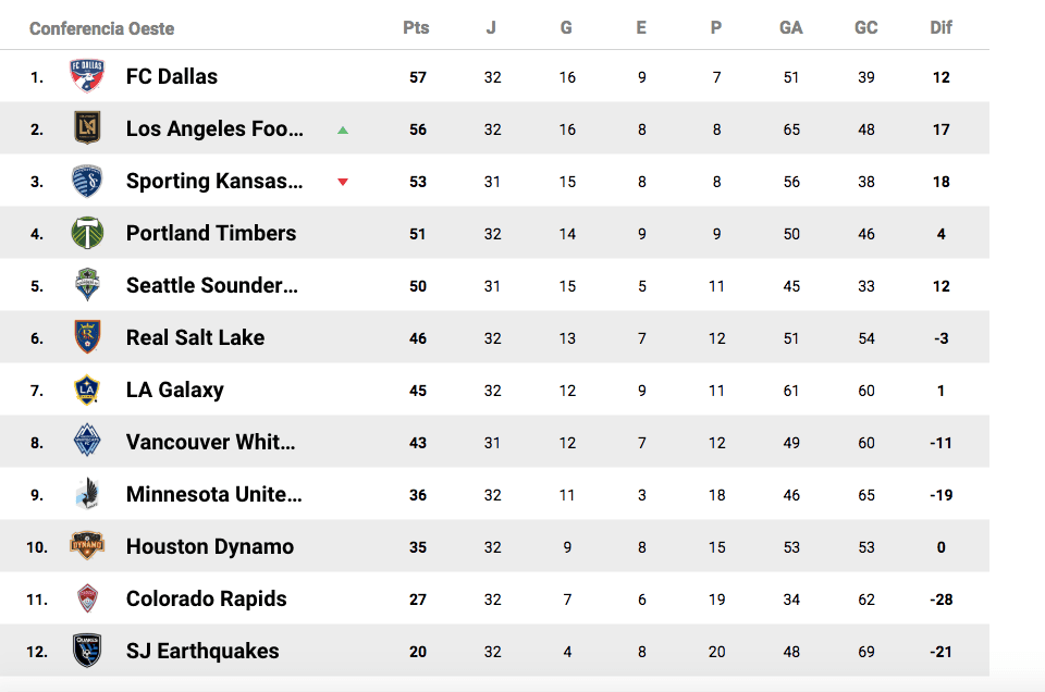 Pese a la caída ante D.C. United, FC Dallas (57) sigue como líder en solitario de la Conferencia Oeste. Mientras tanto, el brillante triunfo de LAFC (56) frente a Houston Dynamo lleva al club californiano hasta la segunda posición de esa zona. El tercer lugar está en poder de Sporting Kansas City (53).