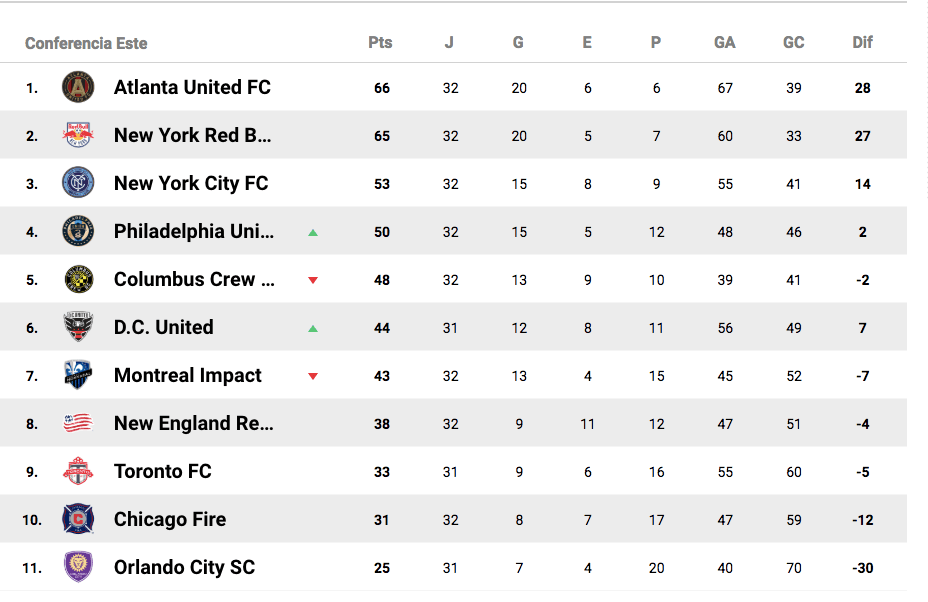 Montréal Impact (séptimo, con 43 puntos), D.C. United (sexto, con 44 unidades) y Columbus Crew SC (quinto, con 48) son los tres equipos con opciones de jugar en la postemporada.