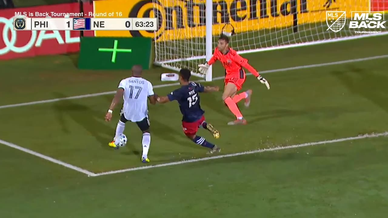 Los dirigidos por Jim Curtin recuperaron el esférico en media cancha justamente cuando New England desplegaba a toda velocidad su contrataque. Jamiro Monteiro filtró un pase globeado al área. Santos controló y con poco ángulo no la pensó dos veces, sacó un cañonazo que venció a Matt Turner.
