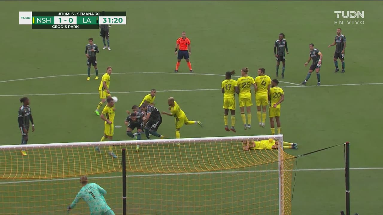 Javier Hernández prueba suerte a balón parado, pero el balón pega en un defensa al 32’.
