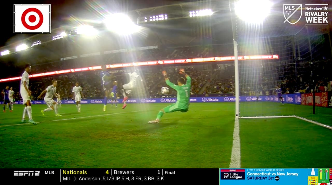 El delantero de los Earthquakes, Jeremy Ebobisse, no pudo vencer al portero de LA Galaxy a pesar de rematar dos veces seguidas en una misma jugada en el corazón del área.