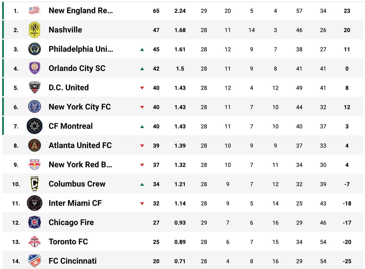 La primera posición sigue en poder de New England Revolution (65 puntos), seguido por Nashville SC (47), Philadelphia Union (45) y Orlando City (42).