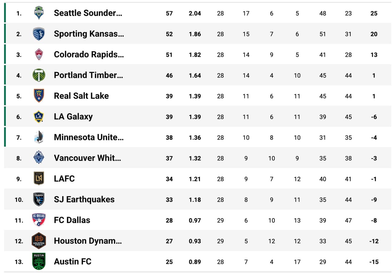 El conjunto esmeralda goleó como local por 4-1 a Vancouver Whitecaps y selló su participación en la postemporada, con 57 puntos. Sin jugar este fin de semana, Sporting Kansas City mantiene la segunda plaza (52), mientras que Colorado Rapids remontó su encuentro frente a Minnesota United y se asienta en la tercera posición (51). El cuarto lugar es para Portland Timbers (46).