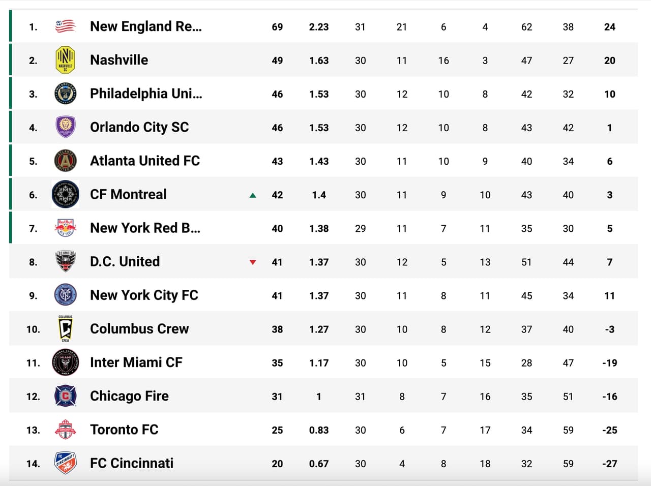 En el Este, las cosas siguen siendo dominadas por New England Revolution (69 puntos), que el miércoles remontó como visitante un partido que perdía ante D.C. United y lo terminó ganando por 3-2.