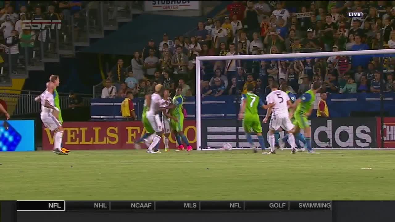 El portero del Seattle Sounders responde rápidamente para detener el remate de Giovani Dos Santos, después de un tiro de esquina.