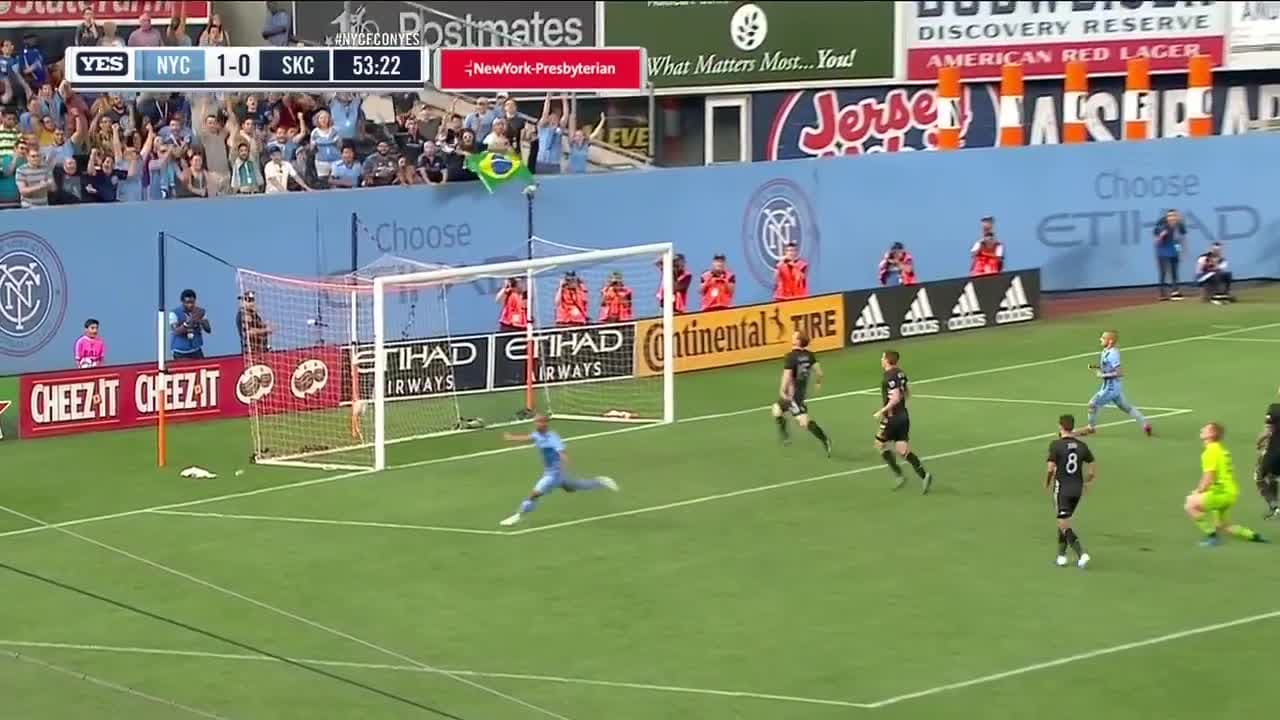 El delantero de los celestes rompe el fuera del juego y define de forma perfecta en el mano a mano contra el portero de Sporting KC, anotando el 2-0 y su noveno del año