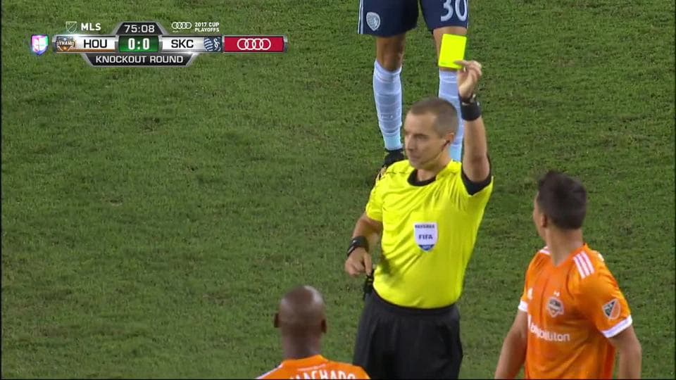 Tarjeta amarilla. El árbitro amonesta a Adolfo Machado de Houston Dynamo on October 26, 2017