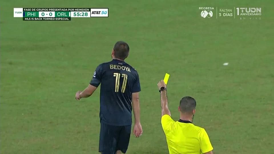 Tarjeta amarilla. El árbitro amonesta a Alejandro Bedoya de Philadelphia Union on July 20, 2020