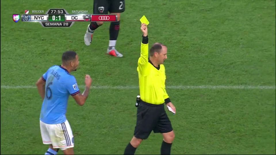Tarjeta amarilla. El árbitro amonesta a Alexander Callens de New York City FC